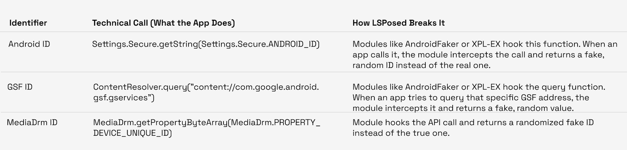 For developers and security teams, the outcome is clear: traditional identifiers like IMEI, Android ID, GSF, and MediaDrm can no longer be trusted as consistent signals of device identity.